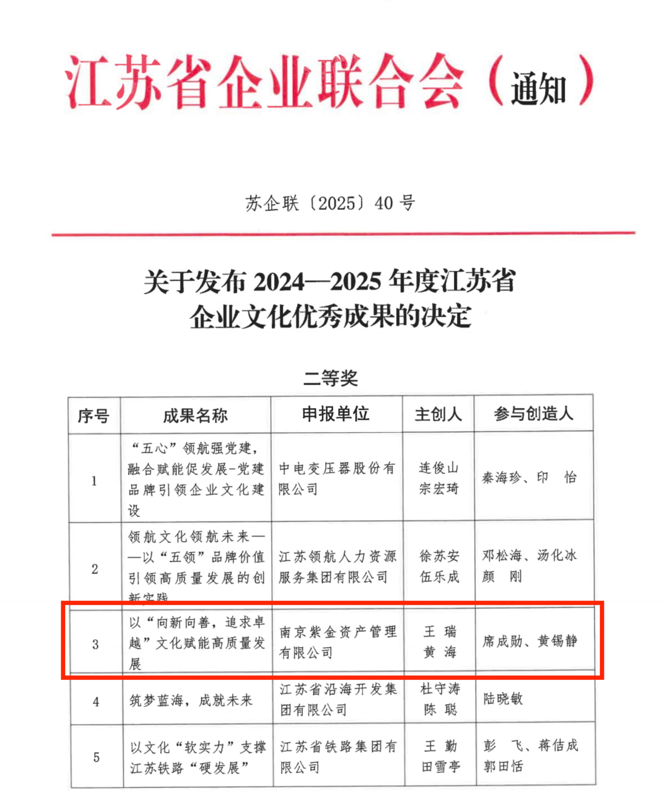 12月25日,江蘇省企業(yè)聯(lián)合會發(fā)布文件《關(guān)于發(fā)布2024—2025年度江蘇省企業(yè)文化優(yōu)秀成果的決定》(蘇企聯(lián)〔2025〕40號)。紫金資管申報的《以"向新向善,追求卓越"文化賦能高質(zhì)量發(fā)展》榮獲"2024—2025年度江蘇省企業(yè)文化優(yōu)秀成果二等獎"。該榮譽是對紫金資管長期堅持企業(yè)文化建設(shè)、以文化引領(lǐng)高質(zhì)量發(fā)展的充分肯定。