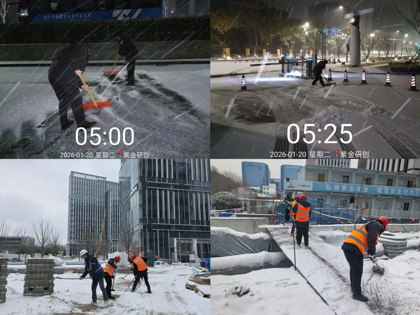 紫金研創(chuàng)嚴(yán)格落實(shí)"門前三包"責(zé)任,針對南北門、主干道、車庫出入口等關(guān)鍵區(qū)域,采取"人工清掃+融雪劑融雪"方式,有序清除積雪。在易滑路段鋪設(shè)防滑墊、設(shè)置警示標(biāo)識,并專人值守出入口,引導(dǎo)車輛有序通行,保障行人及行車安全。數(shù)字研創(chuàng)以安全生產(chǎn)為核心,暫停所有戶外施工作業(yè),組織人員有序轉(zhuǎn)入室內(nèi)安全區(qū)域,同時(shí)開展拉網(wǎng)式安全排查,對施工現(xiàn)場臨時(shí)用房、圍擋等設(shè)施進(jìn)行加固。此外,及時(shí)清理施工現(xiàn)場及周邊積雪積水,在坡道、腳手架等部位鋪設(shè)防滑設(shè)施。